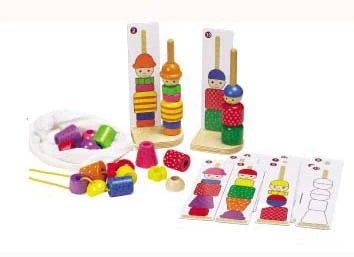 Een volgorde spel met leuke mens-figuurtjes. Kan je het 2-dimensionale kaartje namaken met de grote, houten kralen?