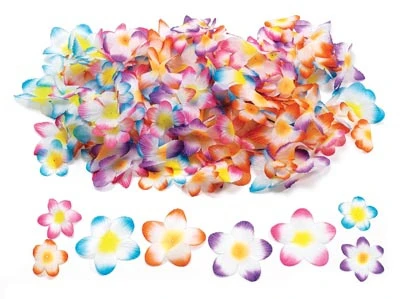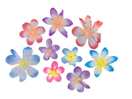 Zak met 200 stoffen bloemen (dat is echt een hoop) met gekleurde puntjes, een witte binnenkant en een geel hart. Daardoor zien de ze er echt uit als lente bloesem. Heel fris en vrolijk.