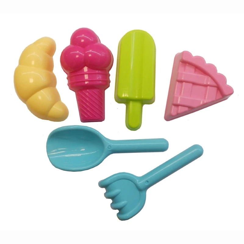 Met de vormpjes maak je zandgebak en ijsjes van zand. Er is een taartpunt, een croissantje, een waterijsje en een ijsje in een hoorntje.