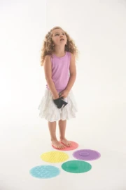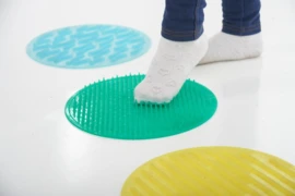 De set bestaat uit 5 grote schijven (35cm) en 5 kleine (8cm). Bij elke grote schijf hoort een kleine met precies dezelfde structuur. Doe de kleiene schijven in het bijgeleverde zakje zodat je ze niet kan zien. Voel in het zakje met je hand aan een schijf en probeer dan met de voeten de bijpassende grote schijf te vinden.