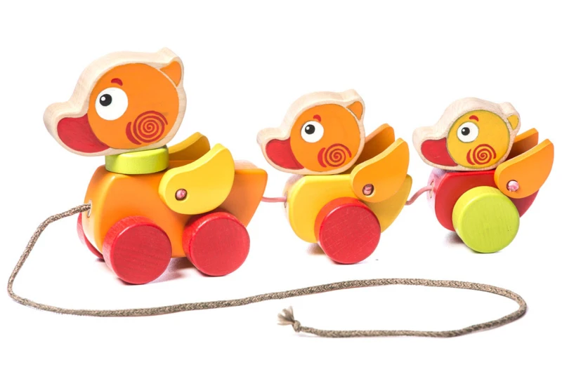 De eendjes zitten met een touwtje aan elkaar vast waardoor ze heen en weer bewegen tijdens het lopen en ook de vleugeltjes kunnen bewegen.
