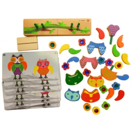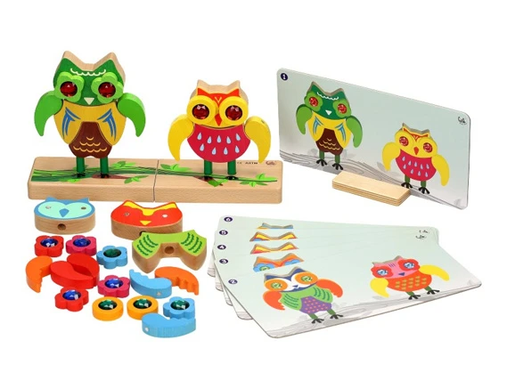 Het spel bestaat uit 6 dubbelzijdige voorbeeldkaarten met daarop 2 uiltjes die je na moet maken met de losse (houten) onderdelen.