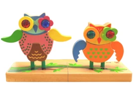 Je hebt een plankje waar de 2 uiltjes op komen te staan. Daar prik je de pootjes in en zo bouw je je uiltje op. Eerst het lijfje, dan het hoofd, de vleugels en dan de oogjes. Maar je moet goed kijken om de uiltjes net zo te maken als op het kaartje, want er is ruime keus uit alle onderdelen. De lijfjes hebben aan beide kanten een andere kleur en de vleugeltjes kunnen op 2 manieren aan het lijfje gezet worden.