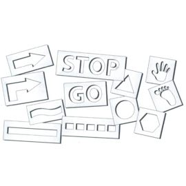Met deze set van 12 plein-sjablonen maak je eenvoudig van kalk een route, parcours, afbakening op het plein grasveld.