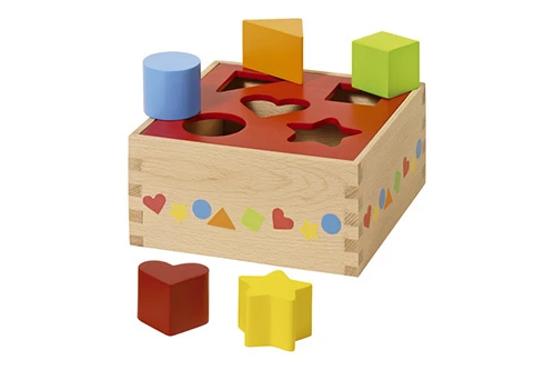Bij de stoof zitten 5 houten blokjes in verschillende vormen en verschillende kleuren.