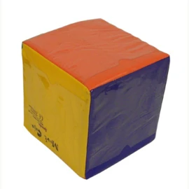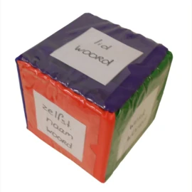Een grote zachte dobbelsteen die je zelf kan vullen. Elke kant heeft een andere kleur met een transparante laag erover. Hier kan je zelf een kaartje insteken met bijvoobeeld getallen, gezichten, foto`s of opdrachten