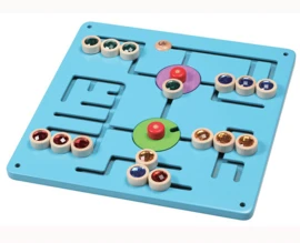 Het wandpaneel bestaat uit een labyrinth met daarin gekleurde diamanten die je door het labyrinth kan schuiven.