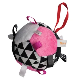 Zachte bal aan een ophanglus met heel veel om te zien en heel veel labeltjes om mee te prutsen.