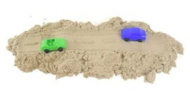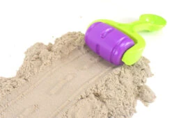 Als je de roller door het zand heent duwt laat hij de afdruk van een weg met 2 banen achter.